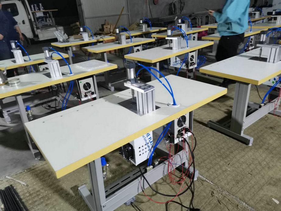 本機以超聲波將綁帶融合于口罩本體兩側,進而完成綁帶式口罩成品,只需一名操作員將口罩片置于超聲波發生器的頭上,后將綁帶放在口罩片上,腳踏踏板使氣缸向下運動,縫住綁帶和口罩片。